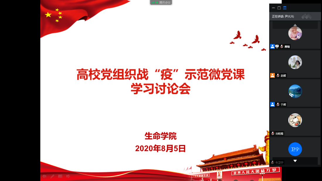 8月5日中午,由我校党委制作的《党旗飘扬 筑牢生命防疫墙》作为全国高校党组织战“疫”示范微党课,在光明网、新华网、央视频、微言教育、哔哩哔哩、中国大学生在线等平台展播。必赢242net官网党委组织全体师生党员观看,并在课后召开了线上学习讨论会。院长尹大川、党委副书记(主持工作)于辉出席会议,党委副书记赵媛媛主持会议,学院师生党员代表参加了讨论会。