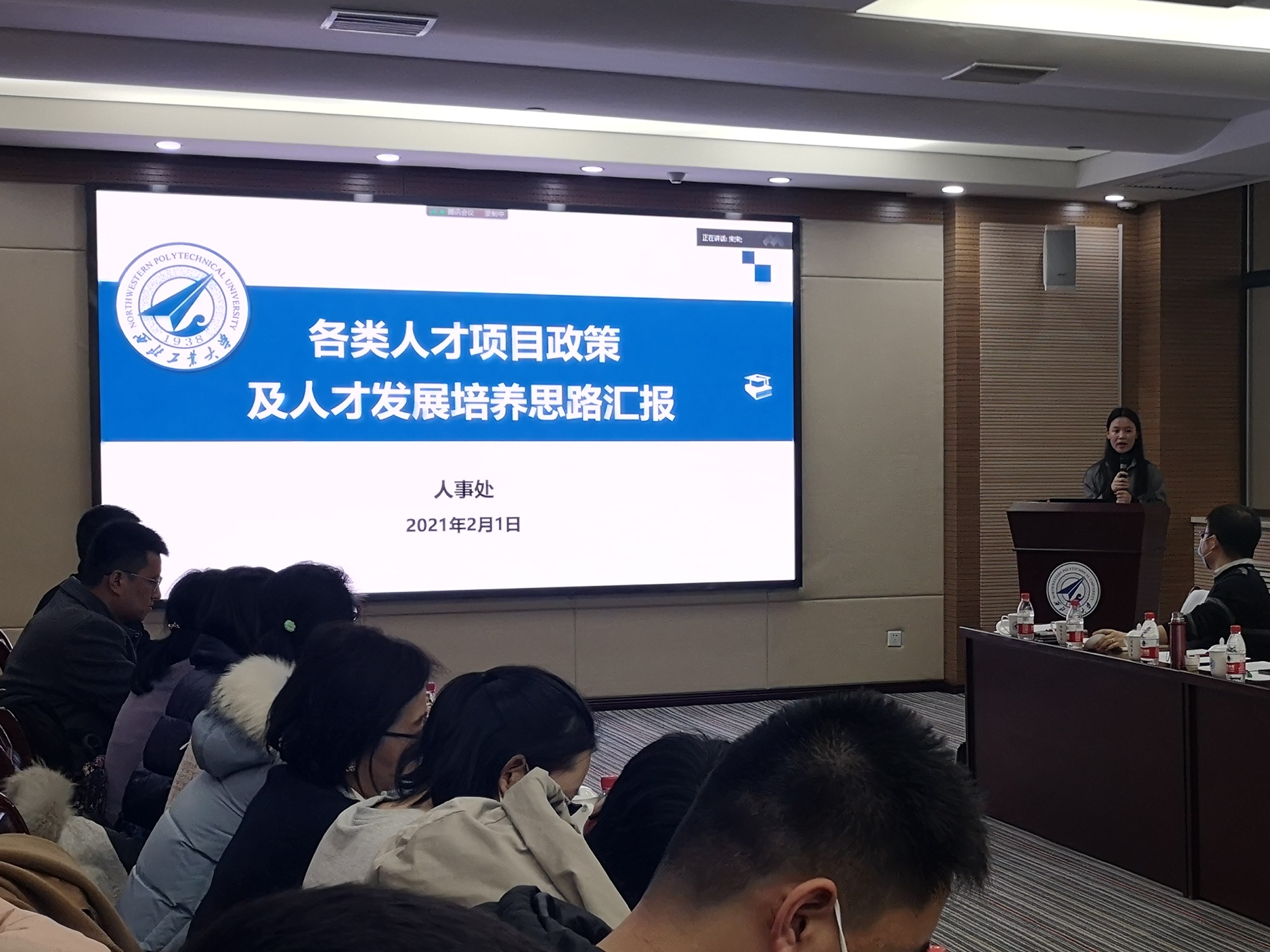 訾方从学校师资队伍现状、人事改革制度情况和教师准聘长聘管理制度三个方面进行介绍。她讲到,学校关注青年教师发展,不断建立健全人事制度体系,通过“优化设置、细化职责、明确目标、严格考核”来促使教师队伍全面健康发展。