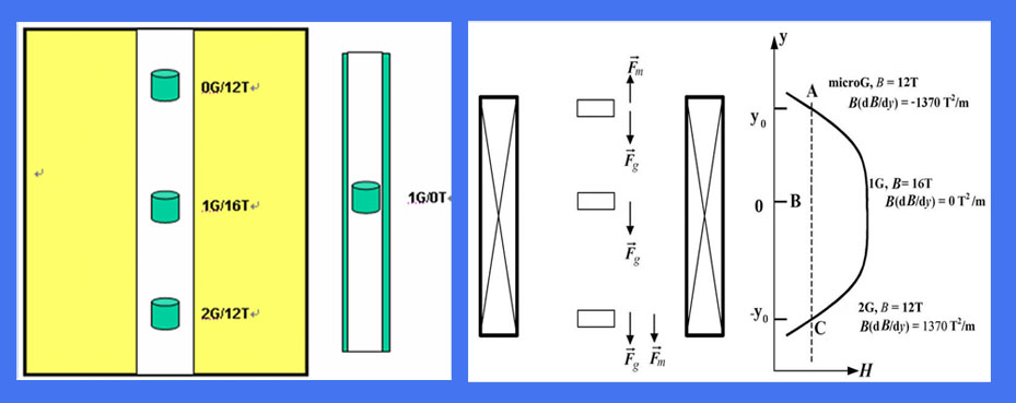 本实验室拥有的超导磁体(JMT16T50F),最大磁感强度16T,磁化水平B·(dB/dz)可达-1500T2/m~1100T2/m,可模拟失重到超重(0G-2G)的重力条件,具备悬浮包括生物、水等抗磁性物质的能力。该磁体是世界上第三台具备悬浮能力的超导磁体,也是目前是我国唯一具备悬浮生命物质能力的磁体。