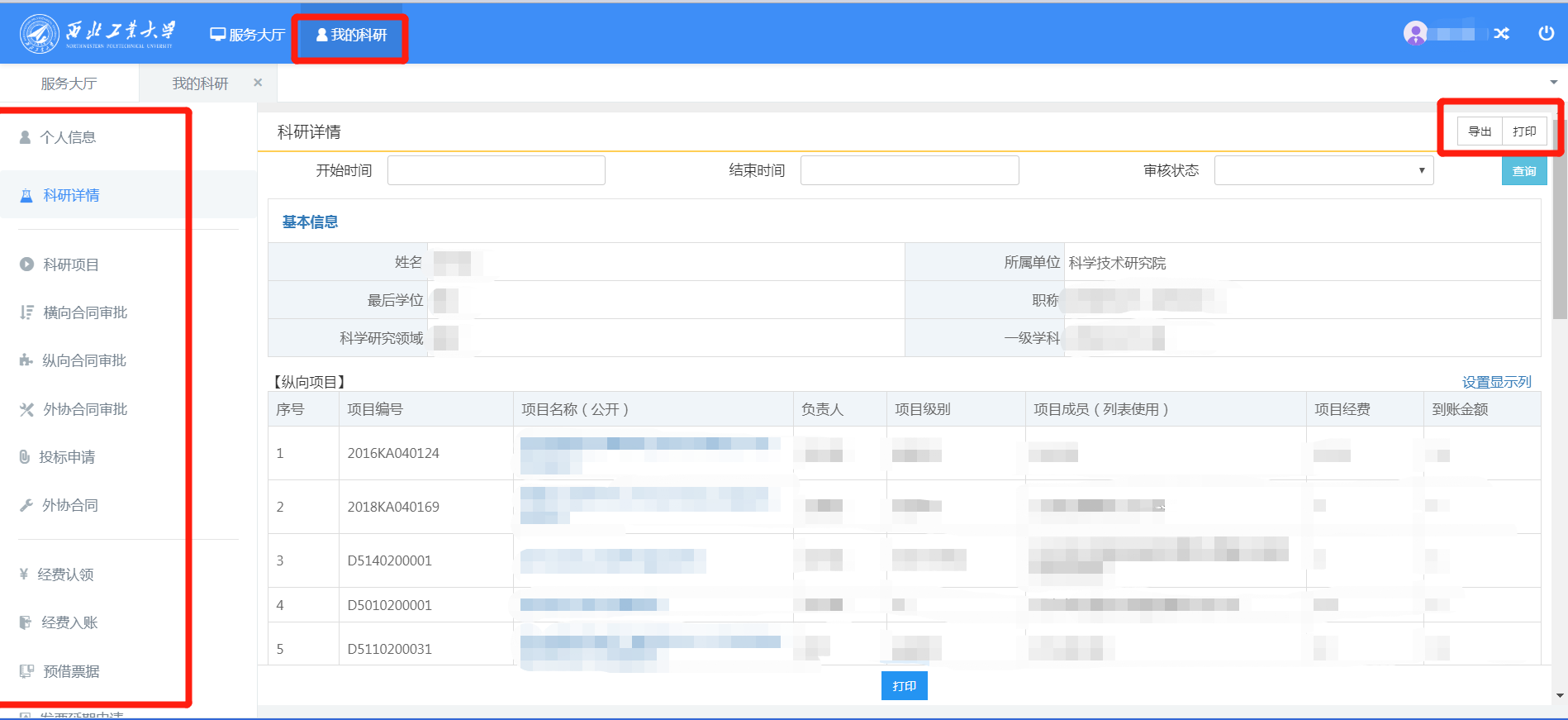 五、点击“我的科研”可查看个人科研详情,包括项目、经费、成果及业务办理等信息。