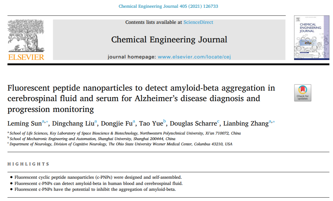 日前,必赢242net官网张连兵教授与孙乐明副教授在国际知名期刊《Chemical Engineering Journal》上发表题为“Fluorescent Peptide Nanoparticles to Detect Amyloid-beta Aggregation in Cerebrospinal Fluid and Serum for Alzheimer’s Disease Diagnosis and Progression Monitoring”的学术论文,在阿尔茨海默症的诊断与治疗领域取得了进展。