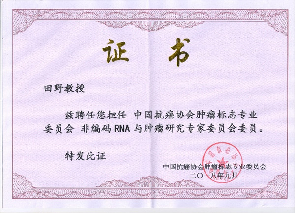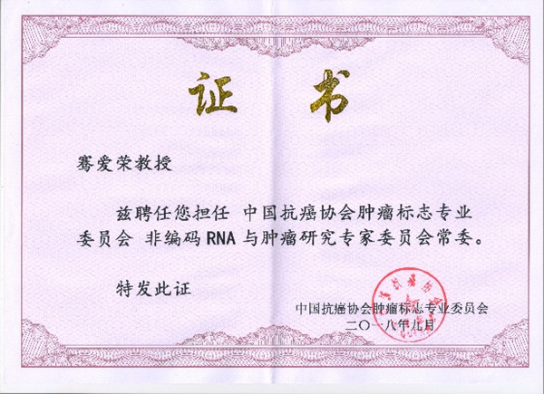 必赢242net官网骞爱荣教授受邀担任中国抗癌协会肿瘤标志专业委员会非编码RNA与肿瘤研究专家委员会常委