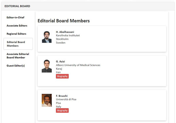 Endocrine, Metabolic & Immune Disorders - Drug Targets杂志于2006年创刊,季刊,由阿拉伯酋长国(United Arab Emirates)的Bentham Science Publishers出版。杂志的主编是来自意大利Department of Basic Medical Sciences Neuroscience and Sensory Organs的Emilio Jirillo博士;编委会成员(Editorial Board Members)目前由20位来自Karolinska Institutet,Alborz University of Medical Sciences,Università di Pisa,University of Athens Medical School等科研机构的科学家组成。骞爱荣教授是所有编委会成员中唯一一个来自中国的女性科学家。(文:吴子祥;审核:赵媛媛)
