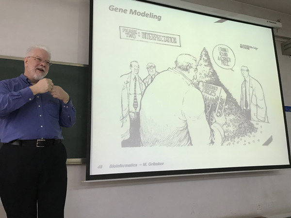应必赢242net官网王素芳副教授邀请,美国普渡大学生物系和计算机系教授Dr.MichaelGribskov于2018年5月访问必赢242net官网,并于5月16日下午在友谊校区给必赢官网研究生授课,课程为生物信息学。