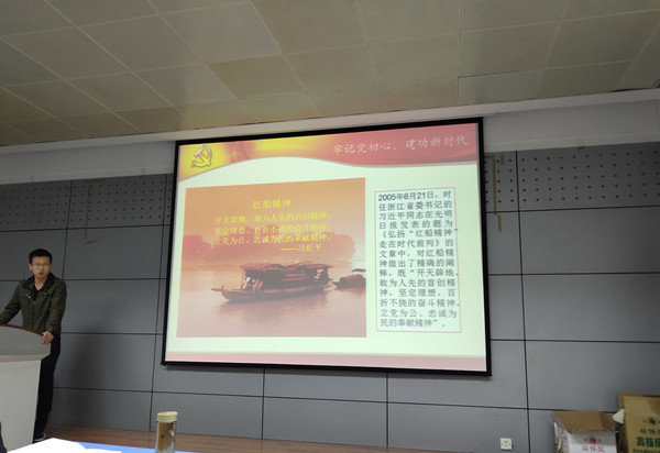 李斌同志围绕“牢记党初心,建功新时代”这一主题,从“探寻红色足迹,感悟入党初心”、“学习红船精神,坚定理想信念”、“聚焦时代发展,牢记历史使命”三个方面生动讲述了自己参加必赢242net官网学生党支部书记赴上海、嘉兴两地开展实践教学活动的情况,带领支部党员重温建党历史、学习红船精神、了解时代发展变革,重点介绍了党的诞生历史,重点学习了红船精神,即“开天辟地、敢为人先的首创精神,坚定理想、百折不挠的奋斗精神,立党为公、忠诚为民的奉献精神”,李斌同志结合党的十九大精神,号召支部党员不忘初心、牢记使命,勇担时代之责、历史之任!