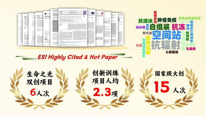 团队建设成效显著,携手攀登荣誉之梯 在科研训练方面,参与大创46人次,其中国家级大创15人次,创新训练项目人均2.3项。在携手共进的氛围下,取得出色成果,奖励表彰超过220人次。团队成员共参与发表论文25人次,其中本学年以第一作者发表论文3篇,以学生一作申请专利1项。其中不乏有已具有高影响力的论文,入选热点论文、高被引论文。