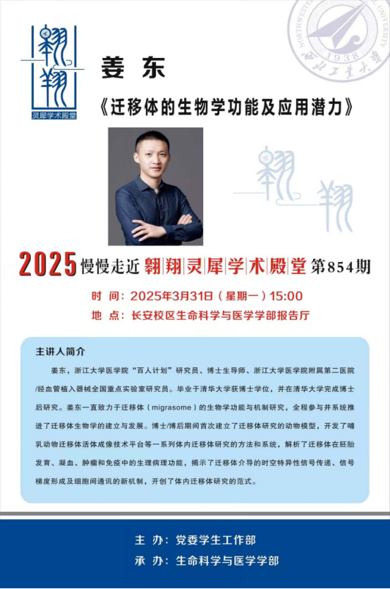 姜东的精彩讲解使师生们深化了对迁移体发展脉络与未来方向的认知。本次学术报告会不仅激发了师生们的科研热情,更拓宽了学术视野,为后续的研究工作提供了重要启发。生命科学与医学学部的学生们将继续秉承“公诚勇毅”的校训精神,以姜教授等优秀学者为榜样,不断追求科学真理、勇攀科研高峰,为人类的健康事业和生命科学的发展贡献出我们西工大生命科学与医学学部学子的智慧和力量。