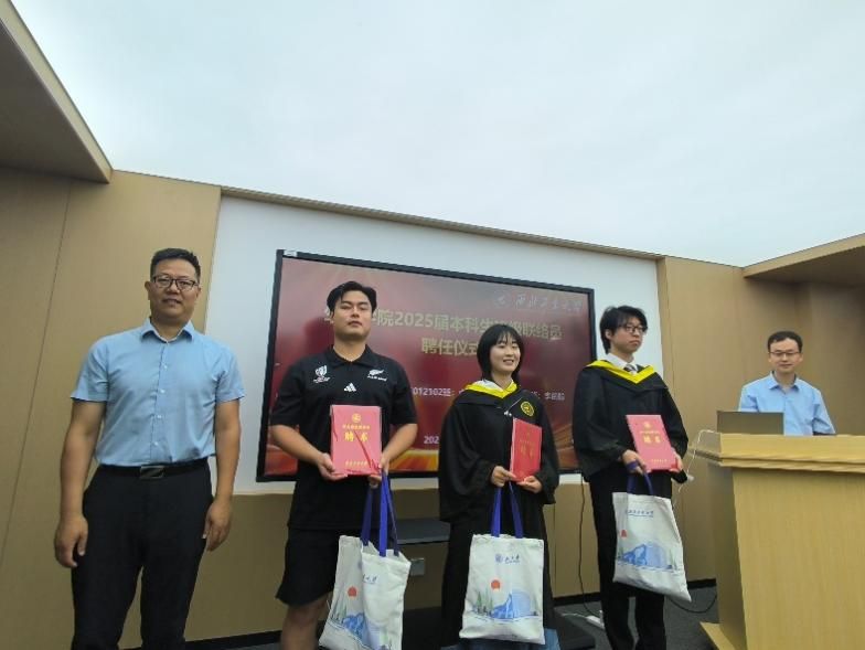 毕业不是终点,而是校友情谊的新起点。首先辅导员任磊旗向同学们宣读了班级联络员职责,接着由万海东为三位班级联络员颁发聘书,并送上校友会准备的纪念品。希望联络员能够肩负起联结母校与同窗的重任,也期待全体毕业生常回家看看!