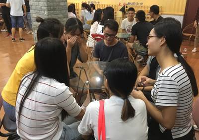 游戏规则:将参与者分为不同组,然后以组为单位,每个组的成员取一张A4纸,卷纸然后组员排序用A4纸将乒乓球流动至终点;期间,乒乓球落地或者碰手均视为无效;最终成绩以单位时间内送到目的地的乒乓球个数为标准。