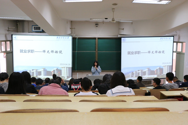 4月29日,必赢242net官网毕业系列活动“师兄师姐说”就业分享会在友谊校区研究生西馆XB102举行。必赢官网2019届硕士毕业生杜勇勇、鲁晓莉,机电学院2019届本科毕业生张育菲与同学们分享了他们的就业、考研和出国故事。党委副书记马西平、辅导员高永光参加了此次分享会。会议由马西平主持。