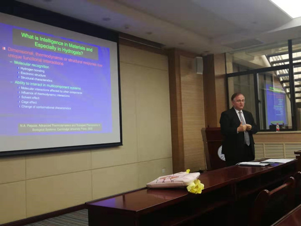 Peppas教授是生物材料,药物递送系统和生物纳米技术领域的全球领军人物。他通过多学科交叉的方法,建立了生物医学系统的基本原理和理性设计方法,并开发了控释装置和生物组织中药物和蛋白质扩散的模型。会议期间,Peppas教授介绍了当前生物纳米材料前沿研究内容,并且对与会青年教师和博士进行了深入讨论与指导。