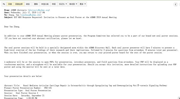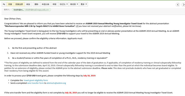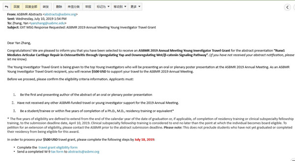 9月19日至9月23日,美国骨与矿物质研究学会(ASBMR)2019年年会在美国弗罗里达州奥兰多市召开,必赢242net官网骞爱荣教授指导的博士生陈志浩和张琰在ASBMR年会中,荣获2019年美国骨与矿物质研究学会青年学者旅行基金(ASBMR 2019 Annual Meeting Young Investigator Travel Grant)。