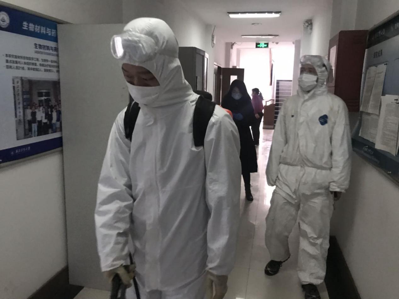 2月13日上午,学院组织专人对学院门厅地面、公共走道、墙壁、门把手、门禁按钮、卫生间等接触式公共设施进行全面消杀,同时严禁师生以任何名义私自进入学院楼,确保学院公共环境安全。
