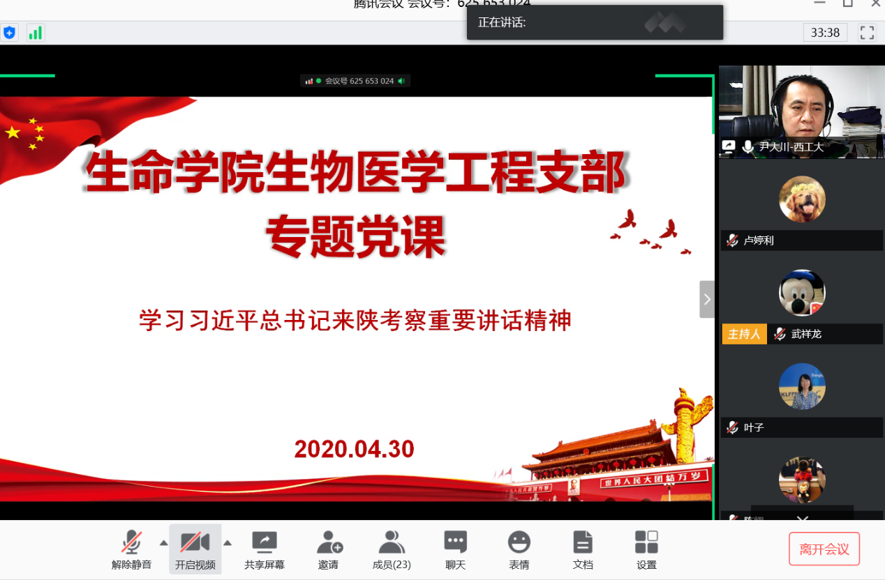 2020年4月30日晚,必赢242net官网生物医学工程系教工党支部采用“腾讯会议”的方式,组织专题党课,邀请学院副院长(主持工作)、学院党委委员尹大川同志为支部党员讲党课,带领大家学习习近平总书记来陕西考察时重要讲话精神,会议由卢婷利同志主持。