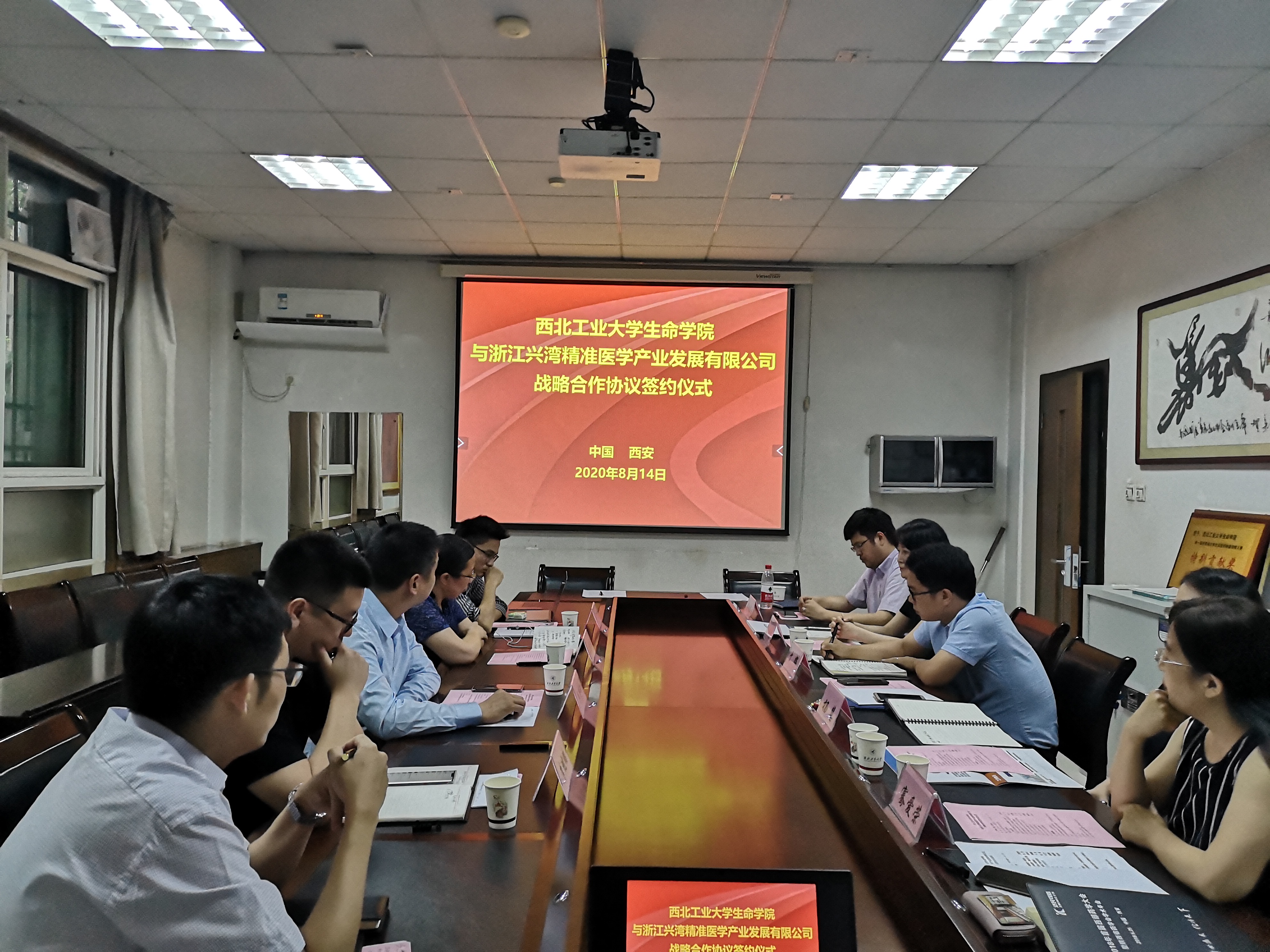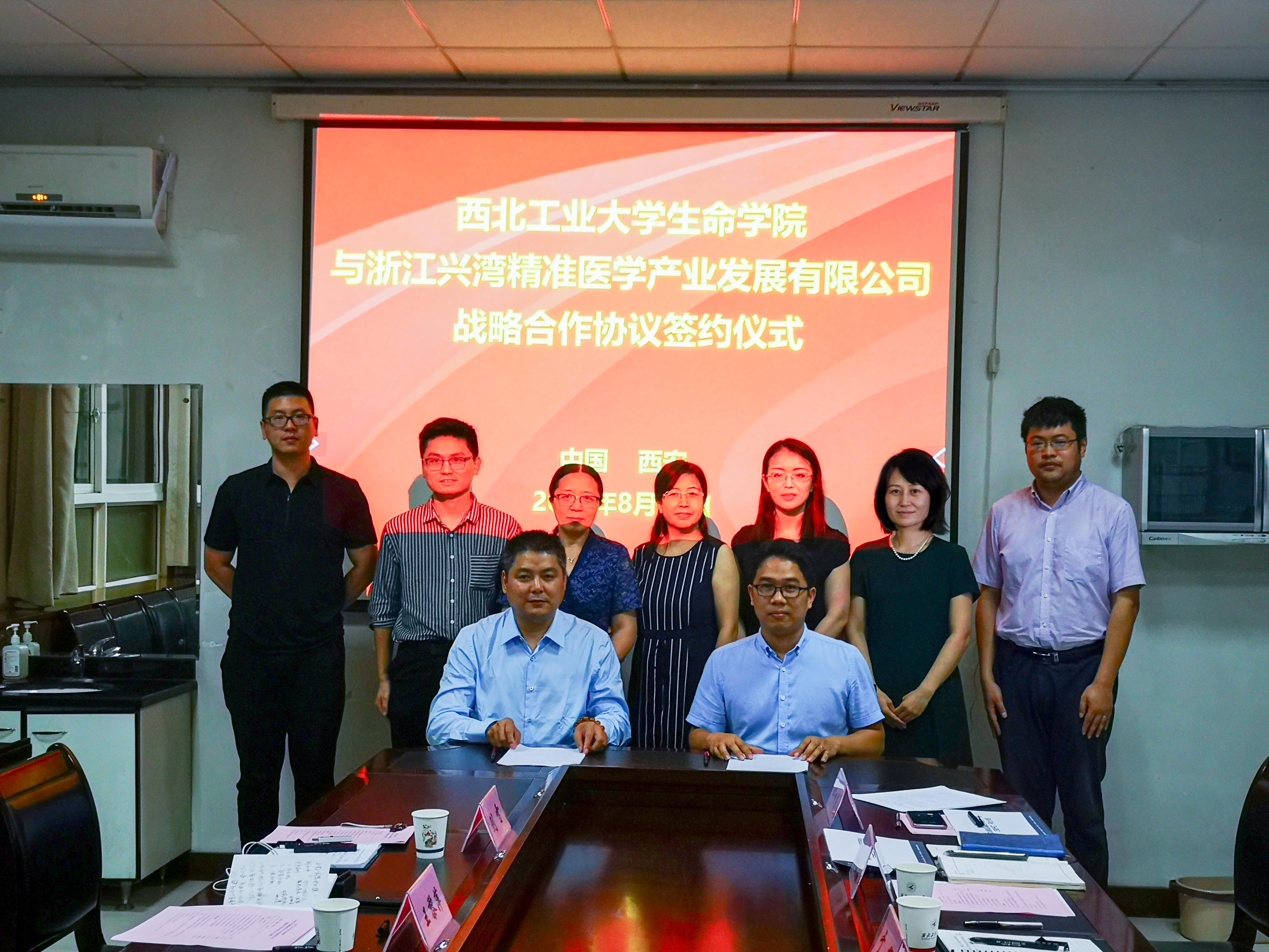 8月14日下午,必赢242net官网与浙江兴湾精准医学产业发展有限公司座谈会暨战略合作协议签约仪式在必赢242net官网102会议室举行。浙江省绍兴市滨海新区管委会招商服务一局局长王黎萍 、项目主管刘雷,浙江兴湾精准医学产业发展有限公司董事长吴兴丰、副总经理李晓鹏,必赢242net官网副书记(主持工作)于辉,副院长杨慧,副书记赵媛媛,学院教授骞爱荣、副教授邓旭东等出席签约仪式。签约仪式由骞爱荣主持。