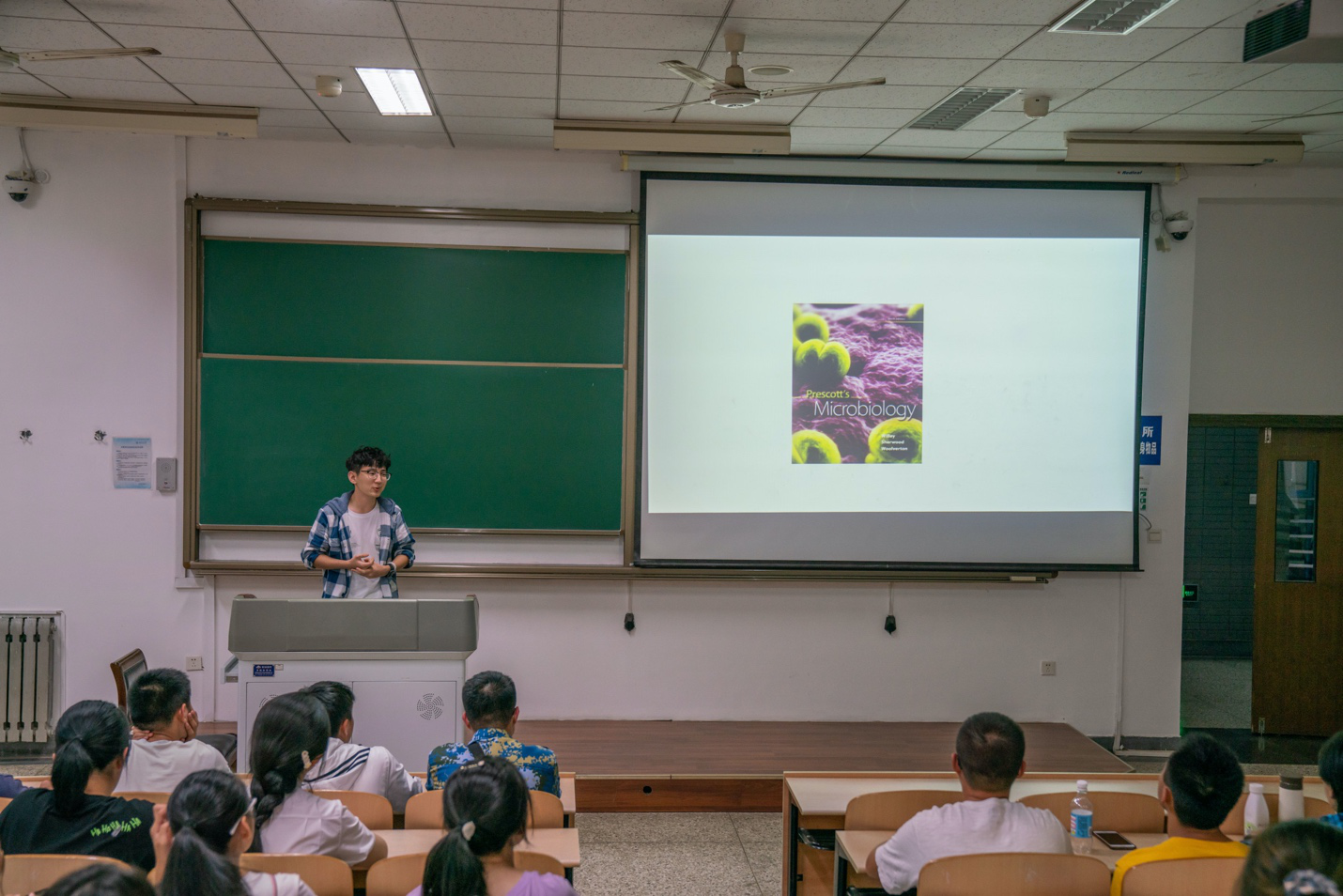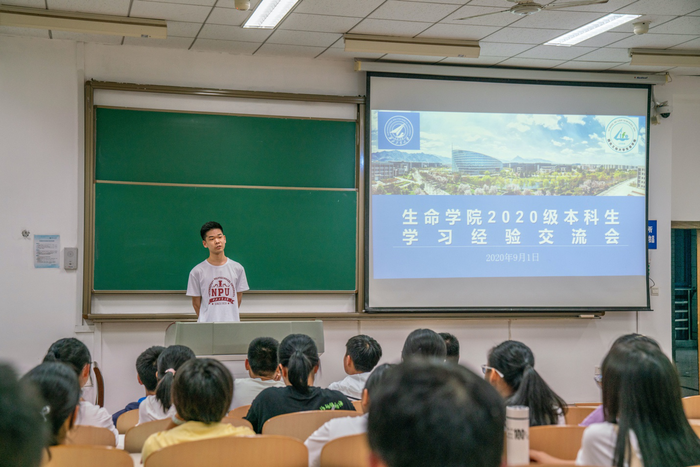 2017级李青阳提到了自己学习英语的经验,告诉大家,学习英语是一个潜移默化的过程,在全英文专业里学习,背单词不需要刻意记住,在平常的上课过程中就会逐渐适应。刘乾隆提到了自己一开始的理想专业是化学,但是通过一年的全英文生物技术专业的学习,他慢慢热爱上了这个专业,他鼓励2020级新生,要多了解生物专业,探索其中的奥秘。2018级张世龙讲解了提前进入实验室开始科研工作的重要性,并且分享了实验室工作、秦岭实习、以及去加拿大进行科研学习交流的照片,生动形象地讲述了自己对生物专业的认识和热爱。陈茁芊通过随机提问两位同学的大学和高中作息时间,引出了如何合理安排大学的作息时间,如何抓住大学四年宝贵的机会,并对全英文专业的优势进行了分析,包括小班研讨授课,老师能够精心辅导,以及对英语学习的促进等等。