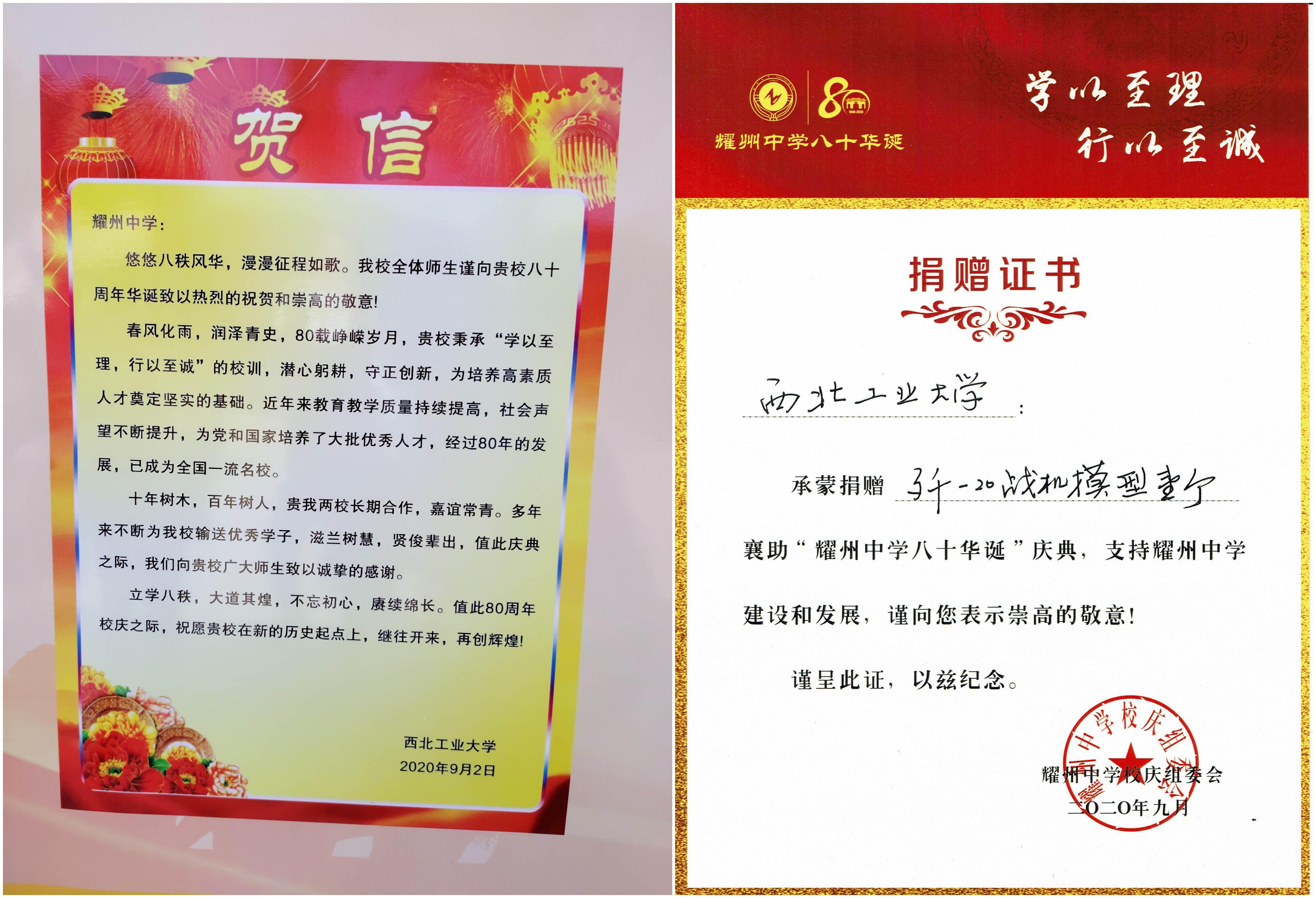 尹大川院长一行代表学校将必赢242net官网致耀州中学80周年校庆贺信及礼品(歼-20重型隐身战斗机模型)赠送给耀州中学,并在签名墙签名。