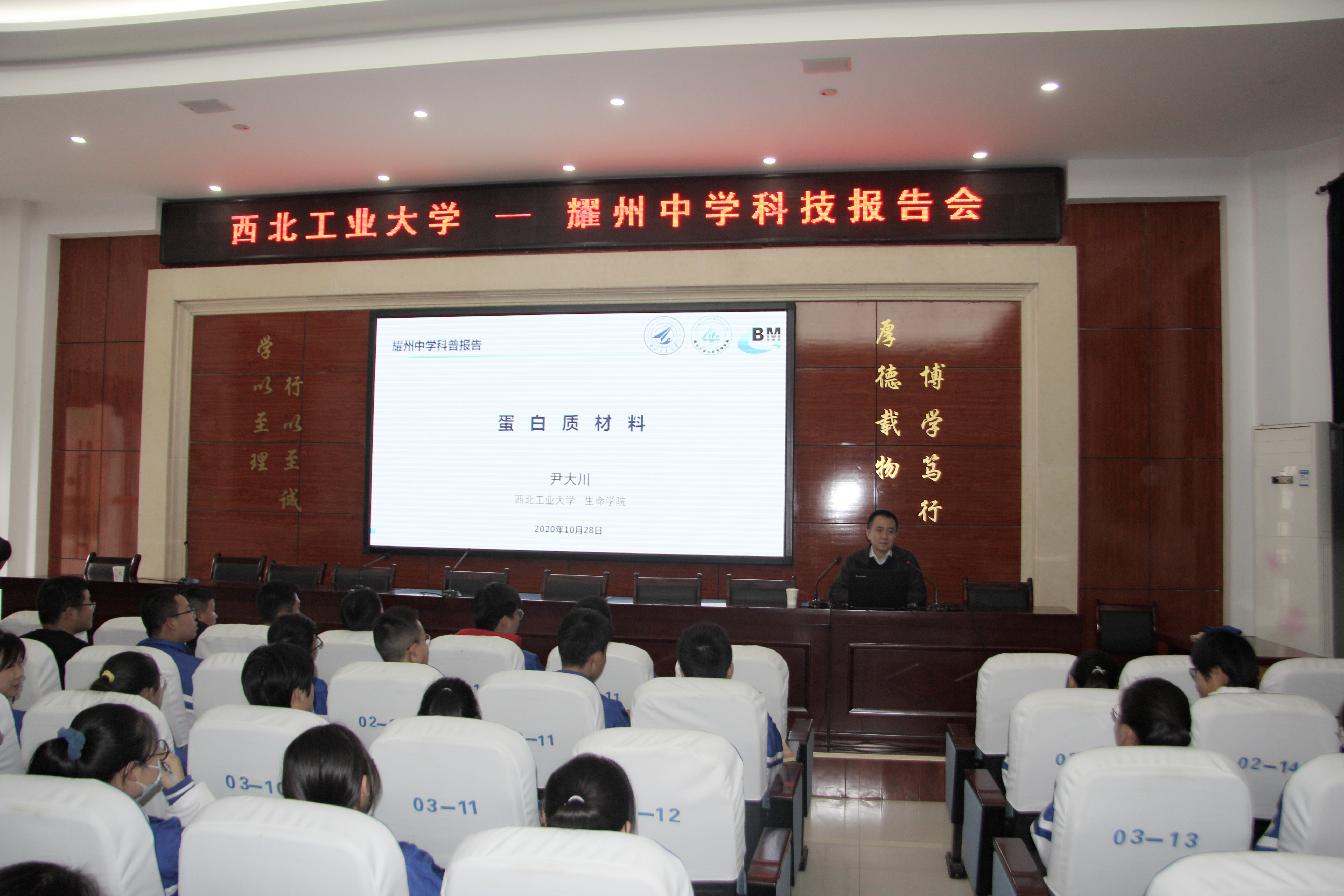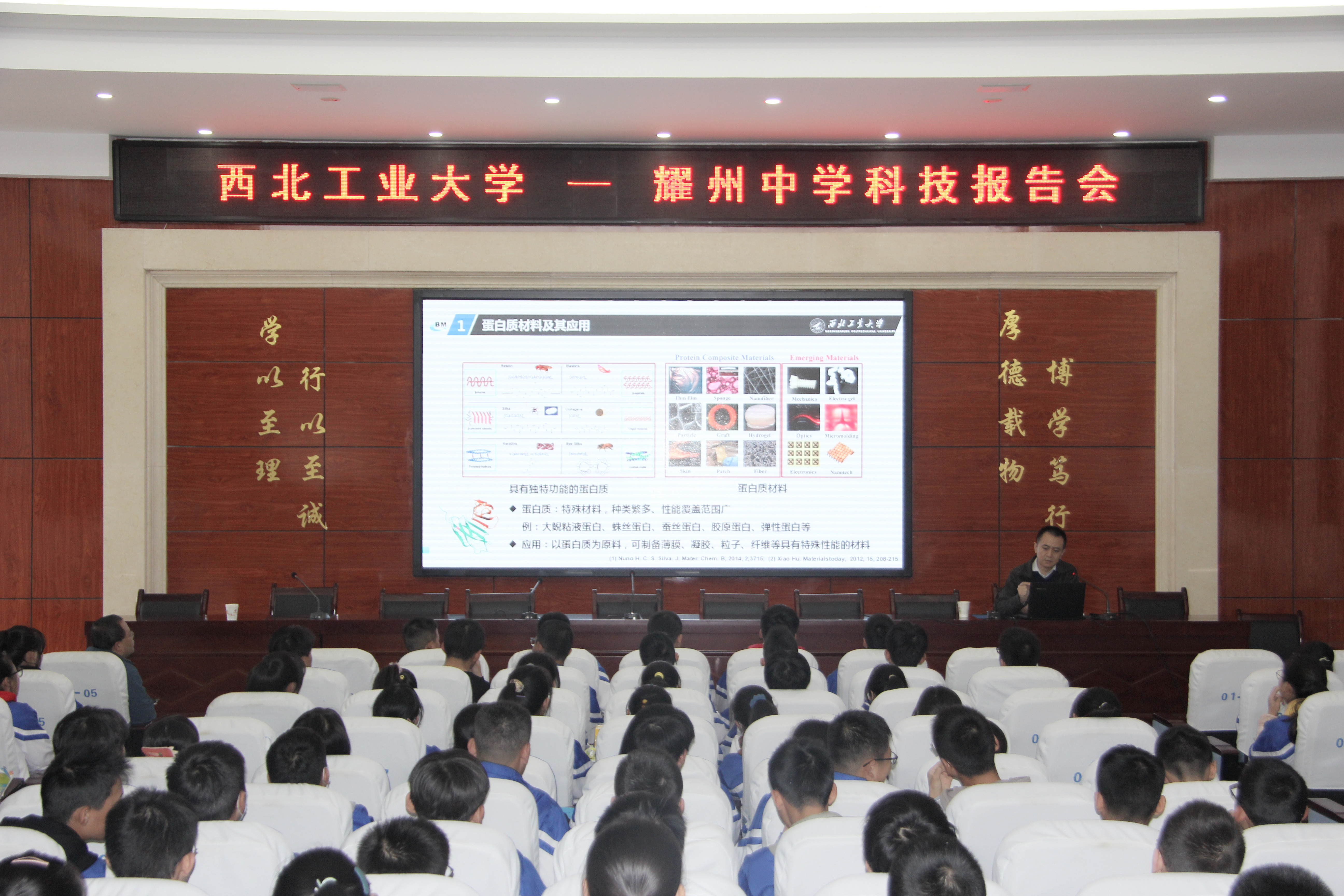 尹大川给耀州中学高一年级精品班约200名同学作了“蛋白质材料”的科普报告。他从我校“三航科技”的学科特色出发,结合自己科研团队多年的研究成果,深入浅出的给同学们介绍了蛋白质学和材料学的学科特点以及最新研究进展。同学们非常热情,积极沟通,有数名同学表示自己深受启发,立志未来将从事蛋白质材料方面的科学研究。尹大川鼓励大家努力学习,利用耀州中学的优质办学资源,不断成长,成就自己的梦想。