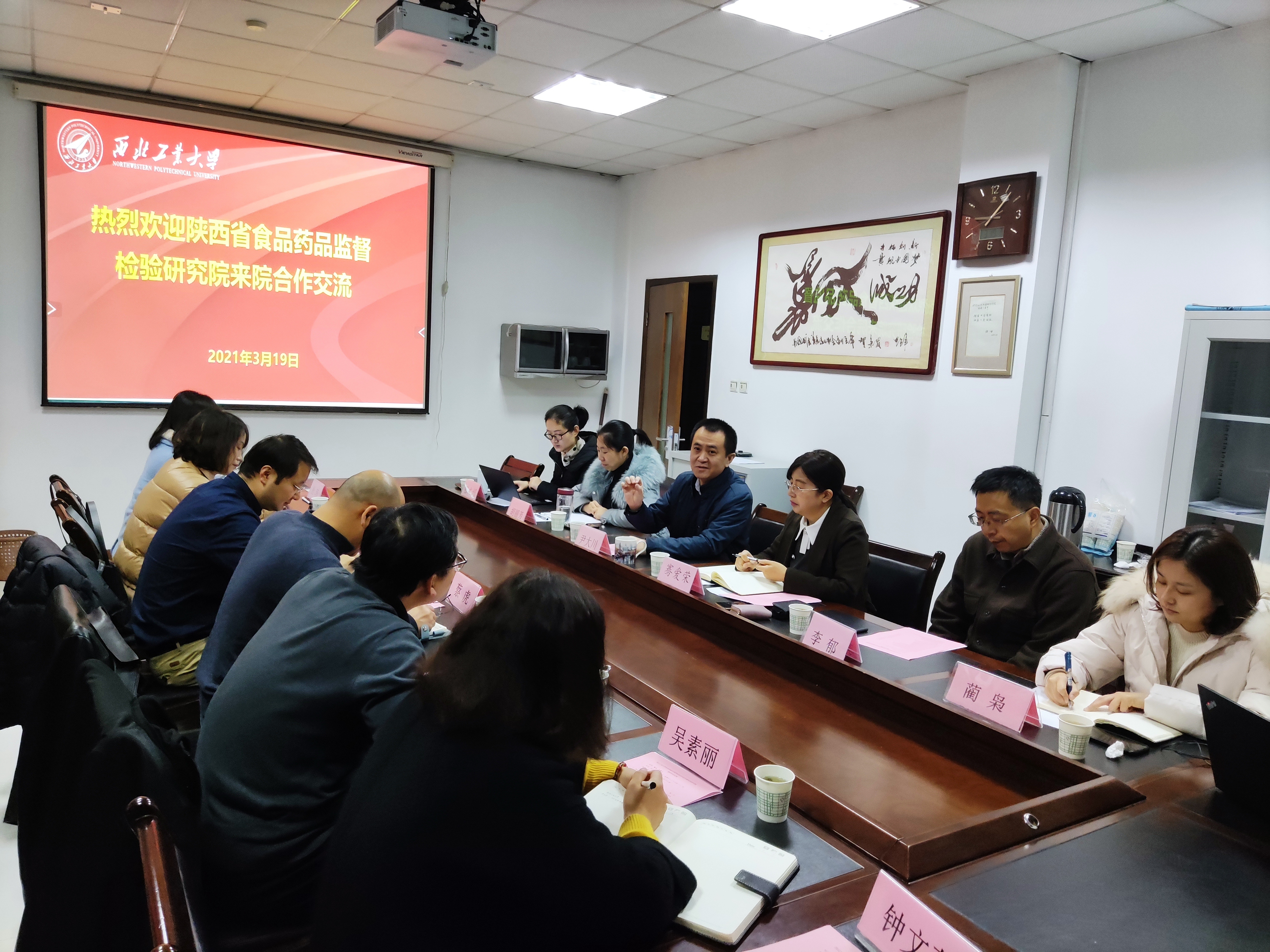 3月19日上午,必赢242net官网与陕西省食品药品监督检验研究院在必赢242net官网102会议室举行座谈交流会。陕西省食品药品监督检验研究院副院长蔡虎、化学室主任冯润东、化学室主任刘雪峰、安评室副主任王莉芳、必赢242net官网院长尹大川、西安市特种医学与健康工程重点实验室主任骞爱荣及教师代表参加了座谈会。座谈会由骞爱荣教授主持。
