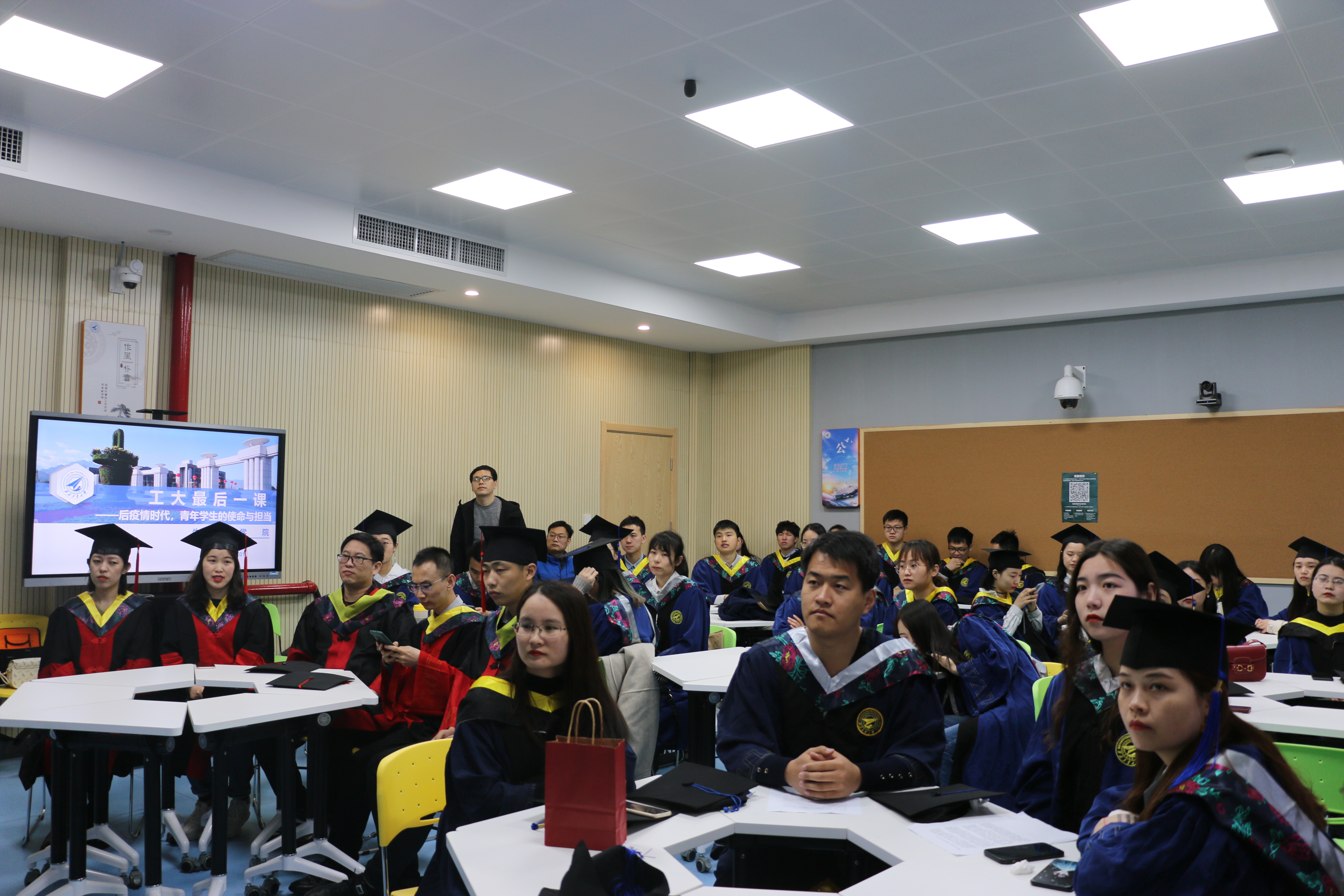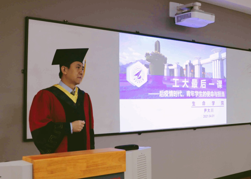 会上,尹大川以“后疫情时代,青年学生的使命与担当”为主题,为毕业生们讲授了“工大最后一课”。他讲到,当今世界正在经历百年未有之大变局,同学们应把准青春的航向,练就过硬本领,找准自身定位,在祖国的万里长空放飞梦想,谱写新时代最壮美的青春之歌。他讲到,同学们都是学校培养的领军型人才,希望同学们志存高远,树立远大理想;聚沙成塔,成功都是从点滴做起的,希望同学们脚踏实地,实现人生价值;要文明其精神,野蛮其体魄,希望同学们张弛有度,锻造健康体魄;要胸怀感恩之心,希望同学们心怀赤城,热爱祖国、热爱母校。