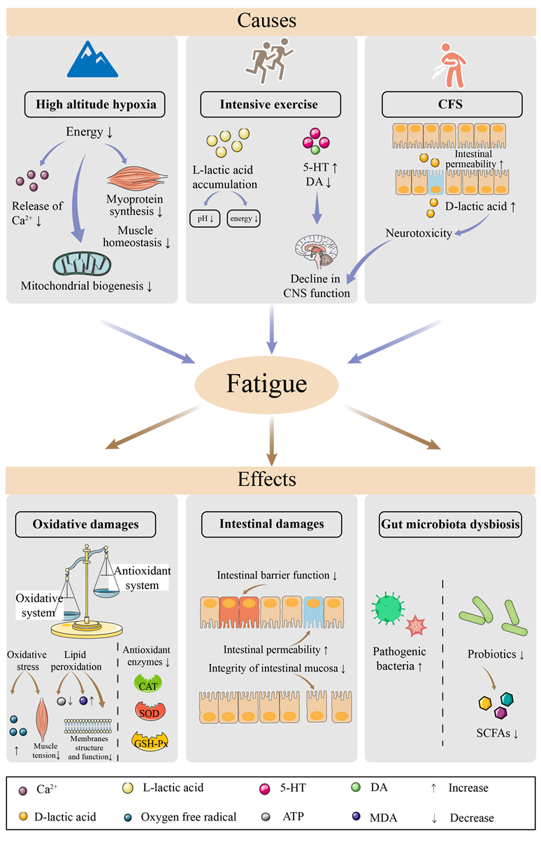 疲劳是人们生活中普遍存在的问题,开发抗疲劳食品对促进人体健康具有重要价值。前人研究大多是从抗氧化的角度去探讨食品的抗疲劳功能。本篇综述则在分析、对比、总结相关研究结果的基础,创新性地提出,肠道菌群可能是抗疲劳食品的作用靶点。综述的主要内容包括(1)在人和小鼠中,疲劳可能增加致病菌并减少有益菌,摄入抗疲劳食品后,肠道菌群改变;(2)疲劳的成因中,乳酸累积、热量减少及中枢神经系统功能降低与肠道菌群代谢相关;(3)疲劳带来的负面影响中,氧化应激、炎症及肠道屏障功能障碍与肠道菌群失调相关;(4)益生菌、功能性营养物质(多糖、多酚等)可抑制致病菌生长、将食物转化为抗氧化或抗炎产物、产生短链脂肪酸、维持肠道屏障完整性、抑制肠道炎症、刺激产生调节中枢神经系统的神经递质。因此,靶向性调控肠道菌群,可以作为开发抗疲劳食品的作用靶点。(文/图:刘冠闻;审核:杨慧)