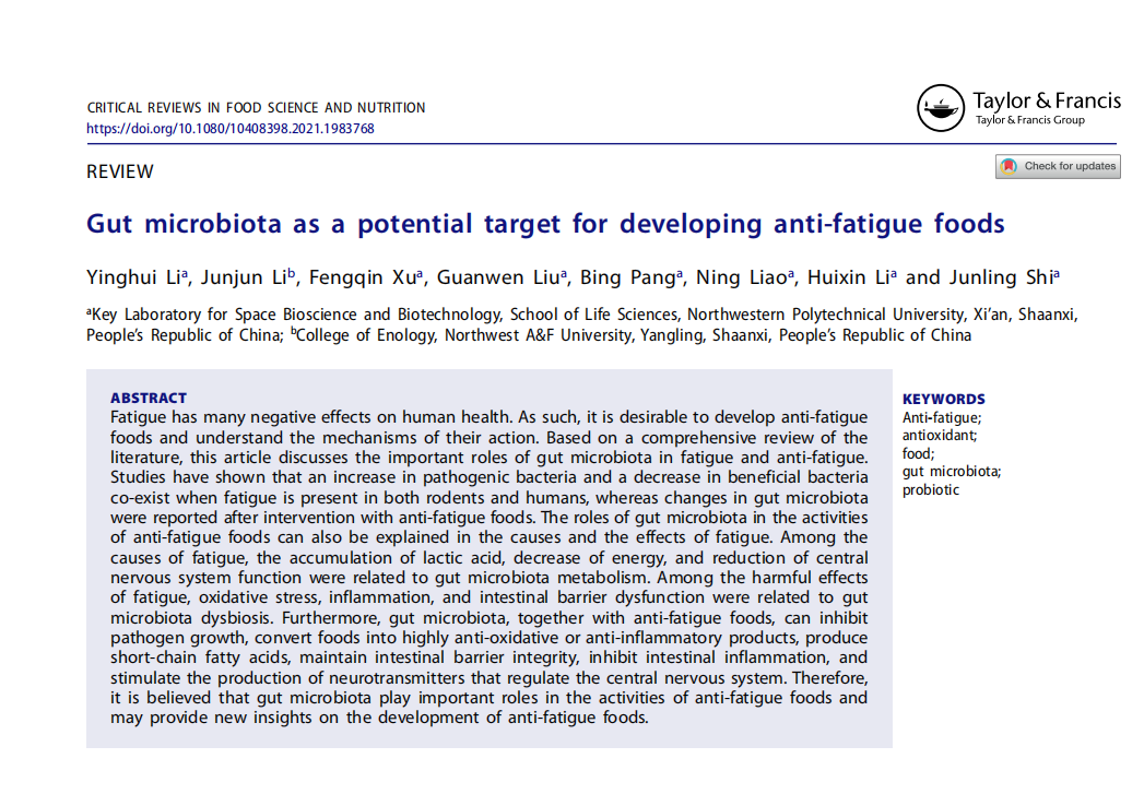 近日,必赢官网硕士研究生李颖慧在食品领域顶级期刊(Critical Reviews in Food Science and Nutrition,中科院一区,IF=11.176,食品领域排名第四,年发文量261篇)发表题为“Gut microbiota as a potential target for developing anti-fatigue foods”的综述性文章。通讯作者为师俊玲教授。师俊玲教授团队主要从事肠道菌群与人体健康方面的研究工作,在开益生菌预防与治疗肠道与代谢性疾病方面进行了大量的研究工作,旨在为开发具有我国自主知识产权的特效性益生菌菌株奠定理论基础。