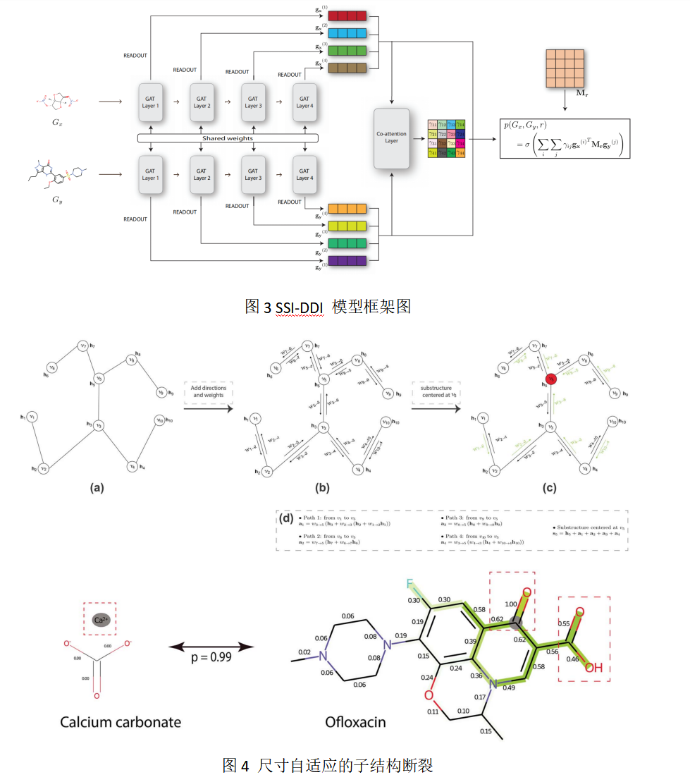 然而,我们发现这个模型所学习到的子结构是固定大小的,等同于图注意力网络的节点,不符合药物药效团的可变尺寸的要求。进而,本研究团队将药物分子的化学键视作控制“门”,在化学结构中具有较低权重的化学键将视作断裂操作,将该药物结构分裂为多个不同尺寸的子结构,从而更符合药效团的构成规律(图4)。类似地,一个联合注意力层仍然被用来捕获每一对尺寸可变的子结构对于形成不同类型药物相互作用的重要性。对应的论文再次发表在《Briefings in Bioinformatics》上[3],其在线链接为:https://doi.org/10.1093/bib/bbab441。(文/图:施建宇;审核:杨慧)