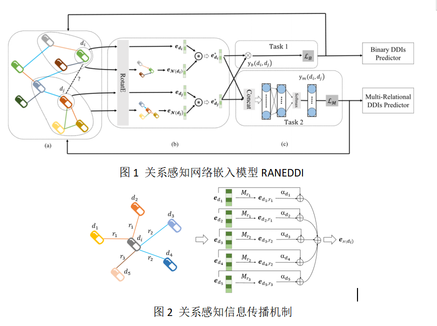 本研究团队研究这一背景下的两个问题。第一个问题是:挖掘现有DDI数据中缺失的相互作用。通过构建了一个DDI知识图谱,设计了一种端到端的关系感知网络嵌入模型RANEDDI。该模型结合了网络中的多关系信息和网络结构信息(图1)。我们首先使用知识图嵌入模型RotatE捕获网络中药物实体之间的多关系信息。然后,提出了一种关系感知信息传播机制(图2),在该机制下,邻居实体先通过对应的连边关系进行转换,然后赋予相应的一个权重,最后综合考虑邻居原有的信息和关系转换后的信息,得到药物的关系感知网络结构的嵌入表示。通过聚合多关系信息和网络结构信息,获得药物最终的嵌入表示,并用于下游的两个DDI预测任务,即单类型DDI预测和多类型DDI预测。在预测的前一百个DDI当中,65个得到了确认。对应的论文发表在《Information Sciences》上[1],其在线链接为:https://doi.org/10.1016/j.ins.2021.09.008。