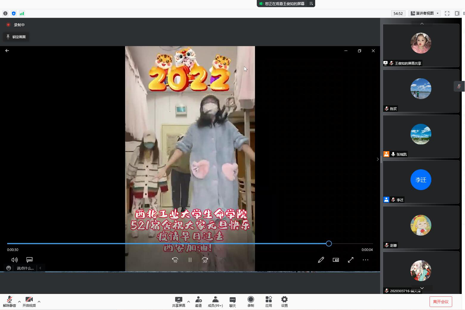 师生志愿者代表师俊玲、呼延霆、贾冠雅谈了参与疫情防控志愿服务工作的感悟。师生集体线上观看电影《我和我的家乡》,进一步激发了师生的家国情怀,与共同的家乡——西安一起坚持抗疫的信心。