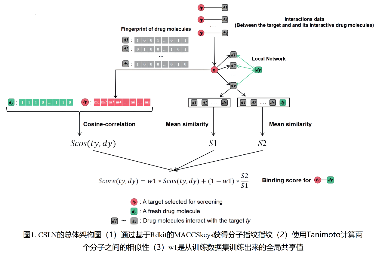 针对上述问题,本研究团队提出了一种基于CSLN(Cosine-correlation and similarity-comparison of local network)的靶标筛选方法,并进行了生物实验验证。该方法根据局部网络的余弦相关性和相似性比较,计算靶标与药物分子之间的结合得分。CSLN的创新之处在于,该方法可以预测新药物分子的靶点,即对于新发现的药物分子,CSLN可以更准确地推荐可能的靶点。它最大的优势在于对药物分子目标的预测不受其拓扑关系多少的限制(图1)。