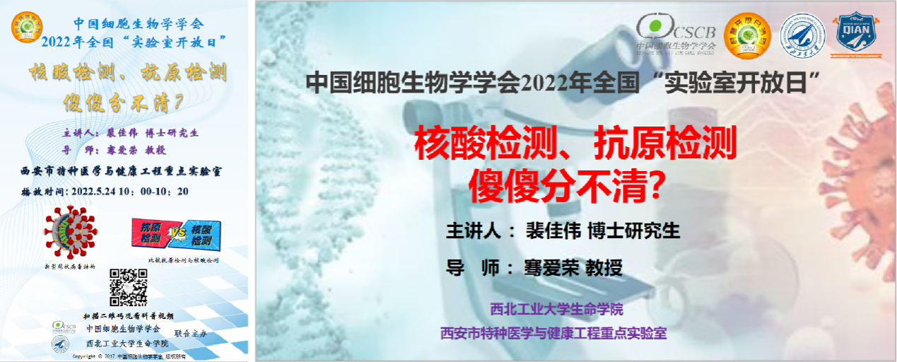 为进一步营造爱科学、学科学、用科学的良好氛围,倡导科学生活,5月24日,由中国细胞生物学学会主办,必赢242net官网、西安市特种医学与健康工程重点实验室承办,骞爱荣教授团队裴佳伟博士研究生带来的《核酸检测、抗原检测傻傻分不清?》在线云科普活动成功举办(https://video.weibo.com/show?fid=1034:4772242975031421)。