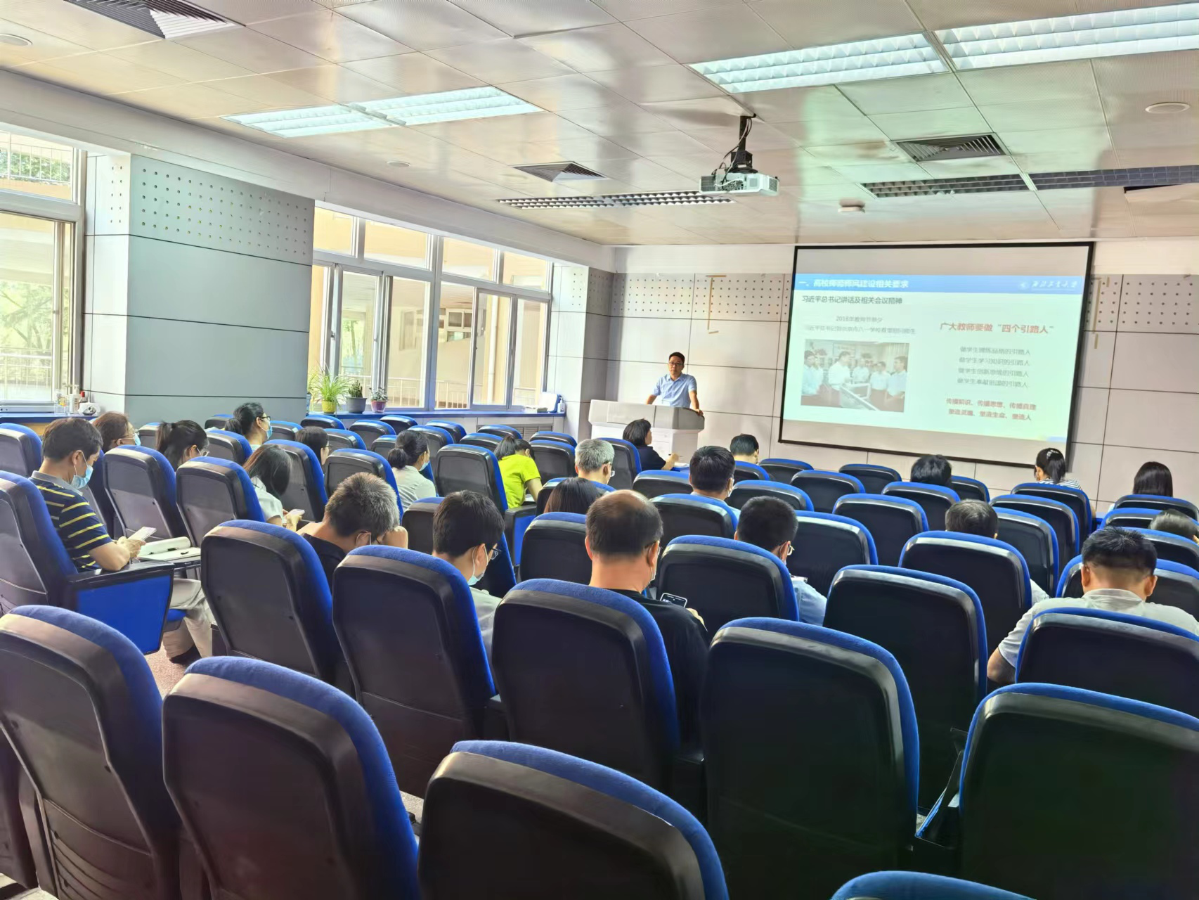 于辉以《廉洁从教从研争做“四有”好老师》为题,围绕高校师德师风建设有关要求、高校师德失范行为典型案例、守纪律 讲规矩 廉洁从教 廉洁从研三个方面,为教职工讲授廉政廉洁党课。他指出,全体教职工一要以理论武装筑牢理想信念,以对党忠诚诠释理想信念,以立德树人锤炼理想信念;二要心怀“国之大者”,坚守为党育人、为国育才的初心使命,立足大格局、大视野,以大先生的要求为引领,努力做学生为学、为事、为人的示范;三要自觉遵守党的纪律,遵守国家的法律法规,遵守高校教师职业道德;四要切实提升育人能力和信息技术应用能力,努力做学生的好朋友和贴心人。(文图/董晨;审核/于辉)