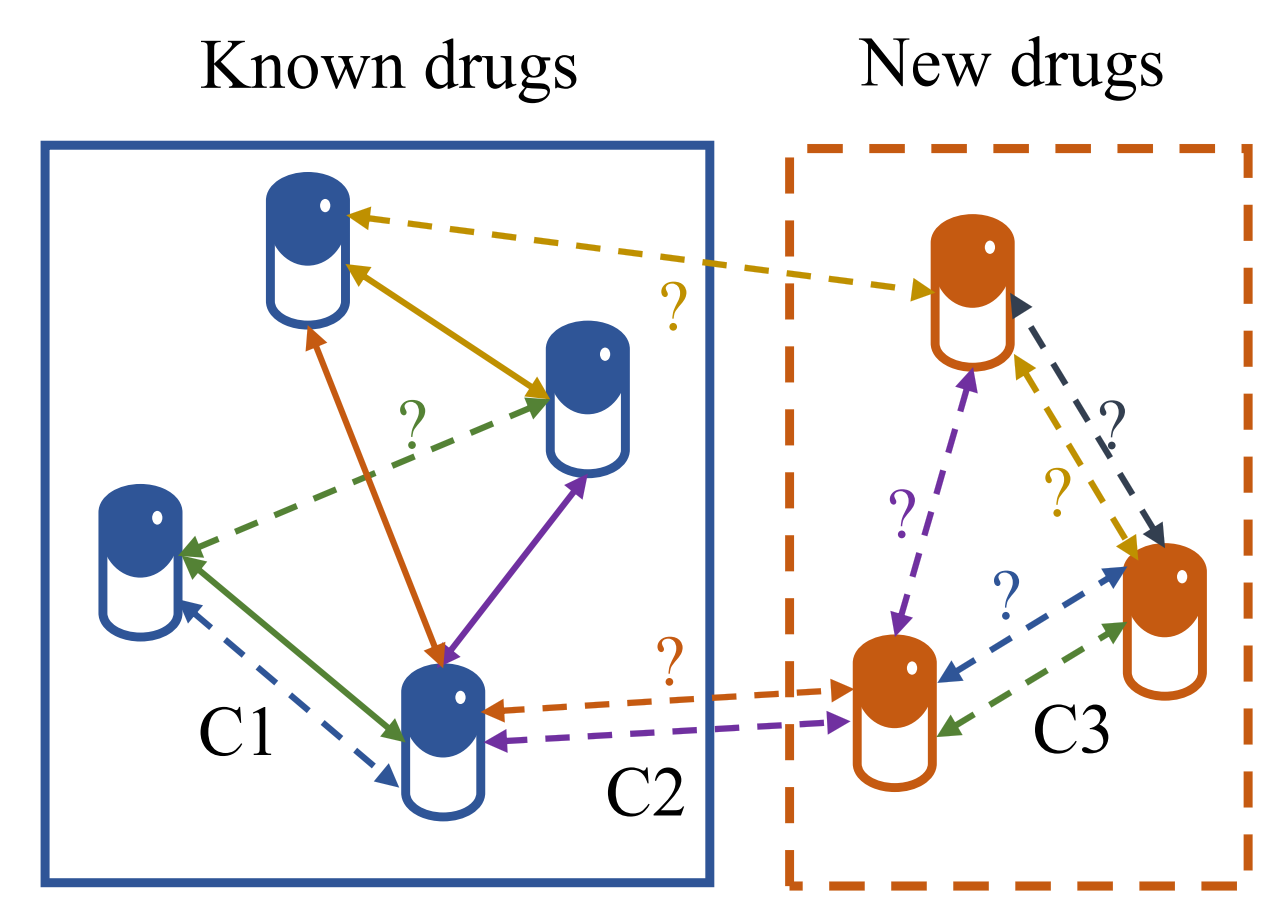 当多个药物同时被服用,药物之间可能会发生意料之外的相互作用(Drug-Drug Interaction, DDI)。DDI对治疗造成的影响既可能有害,也可能有益。有害DDI会降低药物的疗效、引起严重副作用、甚至增加意想不到的毒性,会使得那些使用由多种不同药物组成的药物复方进行治疗的患者处于危险治疗当中。另一方面,有益DDI却会产生“1+1>2”的治疗增效作用,这种DDI也被称为增效药物组合,可以成为一种安全有效的复杂疾病治疗方法,已被成功地应用到癌症和艾滋病等复杂疾病的治疗中。然而,由于代谢动力层级和药物动力层级的复杂机制,导致DDI的类型高达上百种,并可能引发多种不利作用。因此,分析DDI所引发的生物效应模式并提供相应的预测工具,就显得至关重要。这不仅能够筛选有害DDI,同时也能推断增效药物组合,从而应用于复杂疾病治疗。