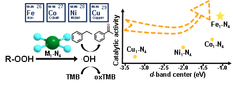 催化氧化过程在化学转化中具有重要意义。其中,氧化能力强且环境友好的羟基自由基(·OH)被广泛应用于催化氧化反应中。近些年研究表明具有类天然辣根过氧化物酶(HRP)活性中心的M1-N4/C单原子催化剂在·OH诱导的氧化反应中表现出优异的催化性能。然而,相关研究工作主要集中在高效M1-N4/C单原子催化剂的设计上,缺乏对于具有不同过渡金属中心的M1-N4活性位点对·OH诱导氧化反应影响的系统性研究。