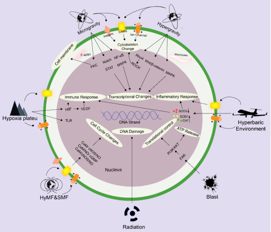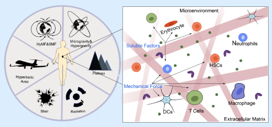 极端环境对人类免疫系统及免疫微环境具有显著影响。极端环境中长时间作业人群往往会出现相应的免疫抑制或免疫失调症状。当机体暴露于极端环境(包括失重、超重、低氧、富氧、辐射、冲击、强磁等),从器官、组织到细胞、分子会发生多尺度变化,包括各种强烈的免疫反应,也有大量研究表明极端环境暴露对免疫系统和免疫微环境产生各种不可逆的损害甚至致死效应。极端环境作用和生理响应信号由免疫微环境传递至免疫细胞表面后,淋巴细胞、树突状细胞、单核细胞、粒细胞等免疫细胞的固有功能同时受到干扰(图1)。为了进一步明确极端环境引起免疫失调的具体机制,各种极端环境的模拟方法应运而生,结合体外条件下免疫微环境的构建方法,为深入研究这些问题提供理论参考和技术策略。因此,本文综述了近年来地基条件下对极端环境的模拟方法以及多种极端环境暴露对免疫系统及免疫微环境的调控规律,并讨论了相关的分子机制、信号通路,可为极端环境相关免疫疾病的临床治疗和预防策略提供新的思路和手段(图2)。(文/图:潘澄薇;审核:杨慧)