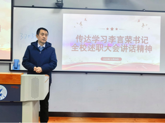 尹大川传达了李言荣书记在学校二级单位考核述职大会上的讲话精神。他讲到,要聚焦“127”目标举措,以“总师育人文化”引领人才培养,以人才强院战略强化人才引育,以有组织科研推进“大项目、大平台、大成果”,以搬迁新校区为契机,新气象、新起点、新征程,凝心聚力推动学院高质量发展再上新台阶。