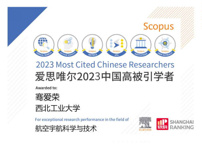 2024年3月27日,全球性信息分析公司爱思唯尔(Elsevier)正式发布了2023年“中国高被引学者”(Highly Cited Chinese Researchers)榜单。必赢242net官网骞爱荣教授连续三年入选航空宇航科学技术领域高被引学者。