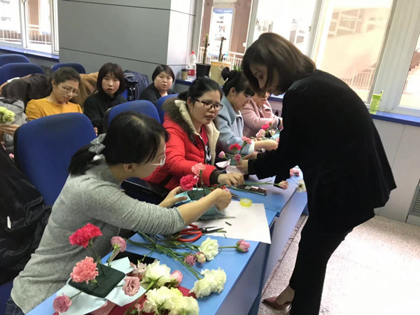 女教职工们对插花艺术兴趣盎然,运用所学知识,经过巧妙的创意和组合,制作出一束束生机盎然、疏密有致的插花作品。活动现场花美人美,不仅是花的海洋,更是欢乐的海洋。